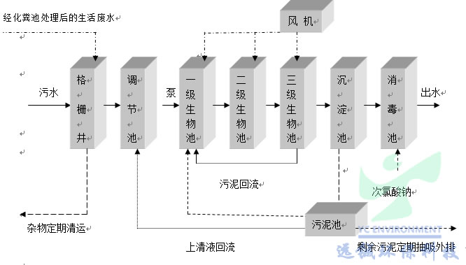 1.1、工艺原理:生物膜接触氧化法是污水由提升泵从调节池送至A级生物接触氧化池,进行酸化水解,降低污染物浓度,去除部分氨氮,然后流入O级生物接触氧化池,进行好氧生化反应来去除剩余污染物,主要工艺为机械鼓风充氧生物接触氧化处理技术,污水通过该池悬挂填料截留下污水中的悬浮物质,并把污水中的胶体物质吸附在它的表面。其中的有机物使微生物在氧气充足的条件下迅速繁殖,同时这些微生物又进一步吸附污水中悬浮物胶体和溶解状态下的物质,逐渐形成生物膜,污水通过生物膜的吸附、氧化絮凝而得到净化。生化池采用立体弹性、组合、或者脱氮填料,填料均匀悬挂不易堵塞,比表面积大,能对气泡用密集性多层次的切割,水流特性优越(填料的好坏决定了微生物生长繁殖,直接影响COD、BOD的去除率)。也可根据出水要求或者村落的河道湖泊治理形成人工湿地法。