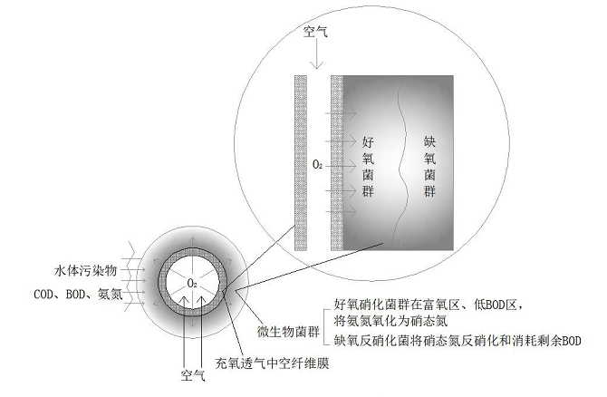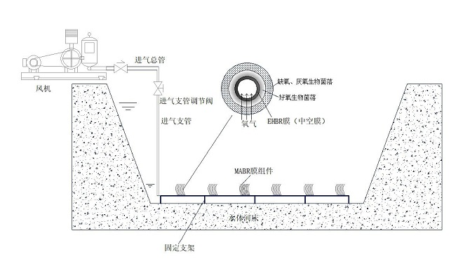 膜曝气生物膜反应器(或称R EHBR 强化耦合生物膜反应器),是膜技术与生物膜技术相结合的一种新型水处理工艺。它是利用透气膜与附着生长型生物膜之间的协同作用,采用透气膜将氧气传递至透气膜表面附着的生物膜层,同时氨和有机物( COD 、BOD )等基质从污水扩散到生物膜层,从而对水体污染物进行消耗、降解,以达到水污染防治标准。