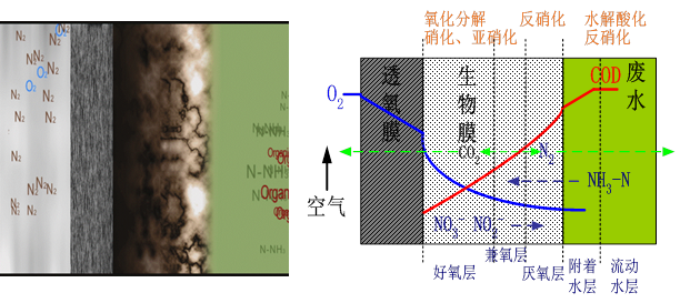 氧气与底物以相反的方向传递,通过控制供氧可使生物膜产生明显的分层,从而达到同时硝化反硝化和去除有机物的效果;